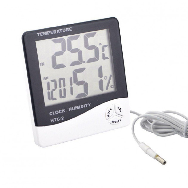 Такий датчик одночасно показує вимірювання температури та вологості, а також запам'ятовує їх максимальне та мінімальне значення. Гігрометр термометр з вбудованим годинником HTC-2 має виносний датчик температури довжиною 1,5 метра, що дозволяє йому показувати вологість і температуру на вулиці.