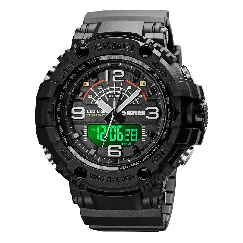 Втілення істинно чоловічого, брутального дизайну наручного спортивного годинника, аналогово-цифровий хронометр Skmei 1617 поза конкуренцією! Рубані, різкі форми корпусу, декор у вигляді металевих «болтів» - хто наважиться кинути виклик цьому втіленню чоловічої войовничої природи?