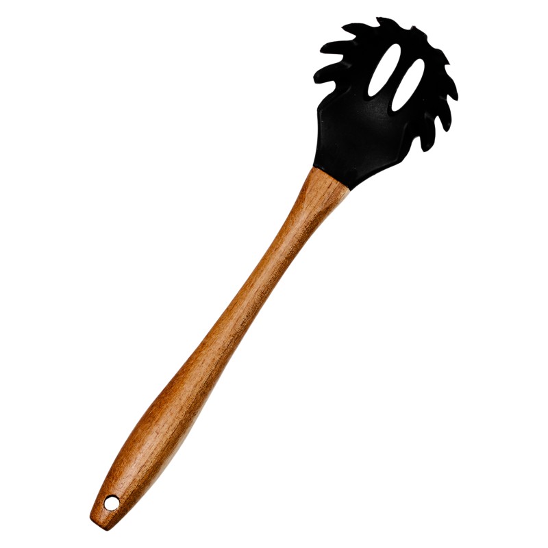 Силіконова ложка спагетті – незамінний аксесуар для любителів пасти. Аксесуар виготовлений із харчового силікону, не дряпає посуд, широкі зубчики акуратно захоплюють спагетті та локшину, а широкі отвори в основі ефективно зливають воду. Ложка має довгу дерев'яну ручку, яка зручно лягає в руку і виключає можливість обпектися. Інструмент можна використовувати для каструль із антипригарним покриттям.