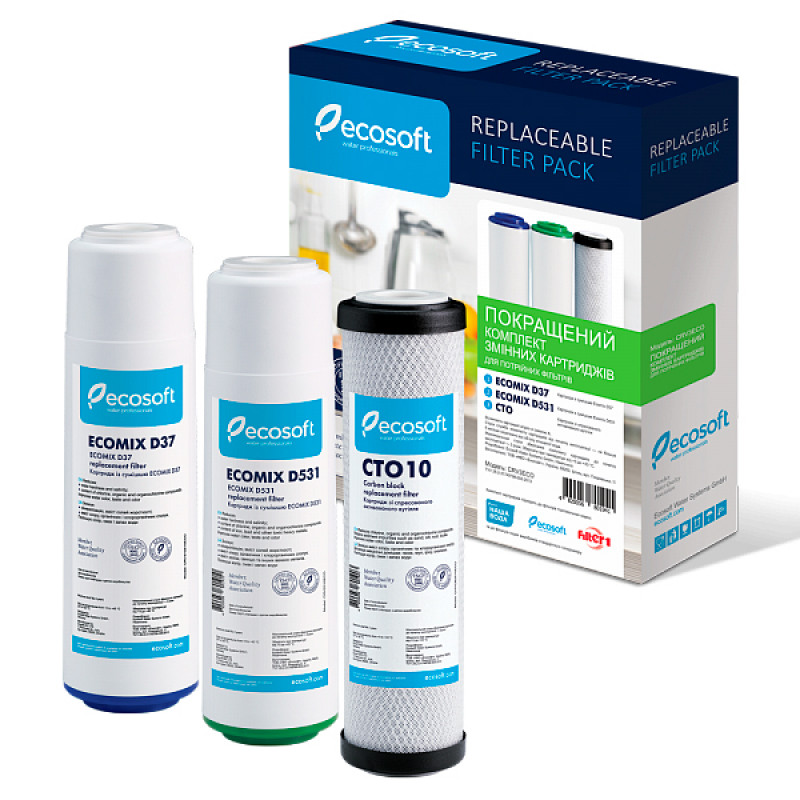 У картриджах використано унікальну технологію Ecomix® — розроблену спеціально для очищення водопровідної води в Україні. Вода послідовно проходить через 3 картриджі, кожен із яких видаляє певні домішки. 1-й ступінь - картридж із сумішшю ECOMIX D37. Знижує вміст у воді солей жорсткості, видаляє хлор, скорочує концентрацію важких та кольорових металів. 2-й ступінь - картридж із сумішшю ECOMIX D531. Забезпечує додаткове пом'якшення та знижує концентрацію фенолів та нафтопродуктів. Ця суміш містить полімерний сорбент, який знижує вміст у воді органічних сполук, заліза та марганцю. 3-й ступінь - фінішне тонке очищення. Картридж із спресованого активованого вугілля зі шкаралупи кокосових горіхів, який видаляє хлорорганічні сполуки та механічні домішки. Картриджі призначені для доочищення лише холодної водопровідної води. Для отримання чистої питної води джерельної якості рекомендується змінювати картриджі кожні 6 місяців незалежно від об'єму відфільтрованої води. Технічні характеристики: Робоча температура води: 4-30 ° С Робочий тиск: 2-5 атм Рекомендована швидкість фільтрації: 1 л/хв Ресурс одного комплекту змінних картриджів: 3000 л ВАЖЛИВО: При першому увімкненні фільтра з новими картриджами злийте перші 7-10 літрів відфільтрованої води в каналізацію. Не слід перевищувати рекомендовану швидкість фільтрації води 1 л/хв – це може погіршити якість очищення води. Ступінь очищення залежить від якості води, що очищається, і може змінюватися в процесі експлуатації. Не слід використовувати змінні картриджі довше (або для очищення більшого обсягу води), ніж рекомендовано. У будь-якому випадку, картриджі необхідно міняти не рідше ніж 1 раз на рік. Комплект змінних картриджів призначений для очищення холодної водопровідної води.
