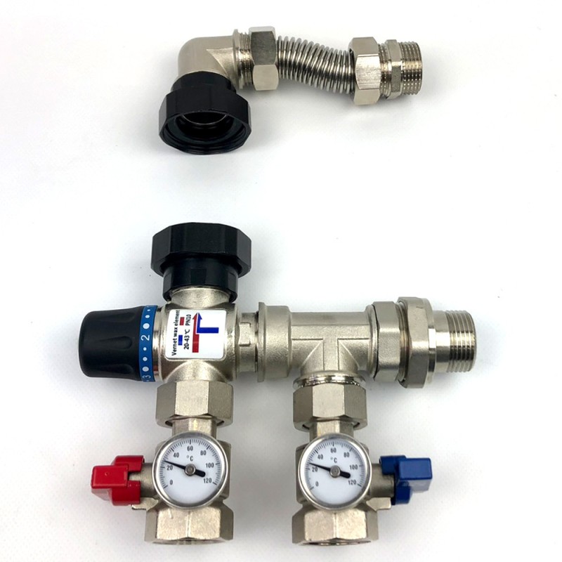 Компактний змішувальний вузол для теплої підлоги FLOMIX Т застосовується для регулювання температури теплоносія, який подається в систему теплої підлоги. Його універсальна конструктивна форма дозволяє встановити його з будь-якої сторони розподільчого колектора і має універсальне гнучке міжосьове підключення , яке практично підходить для всіх виробників колекторів . Зручне нижнє підключення трубопроводів кранами з накідною гайкою і швидке підключення нержавіючим металорукавом до колектору теплої підлоги. Змішувальний вузол оснащений запірними кранами з термометрами для вимірювання температури теплоносія , термостатичним регулюючим клапаном з регулюванням від 20-43 С та витратою 2,5 м.куб за годину для зміщування температури гарячої подачі з холодною зворотною лініями теплоносія. Усі елементи, з яких складається змішувальний узел попередньо герметично зібрані, відповідають усім міжнародним вимогам якості