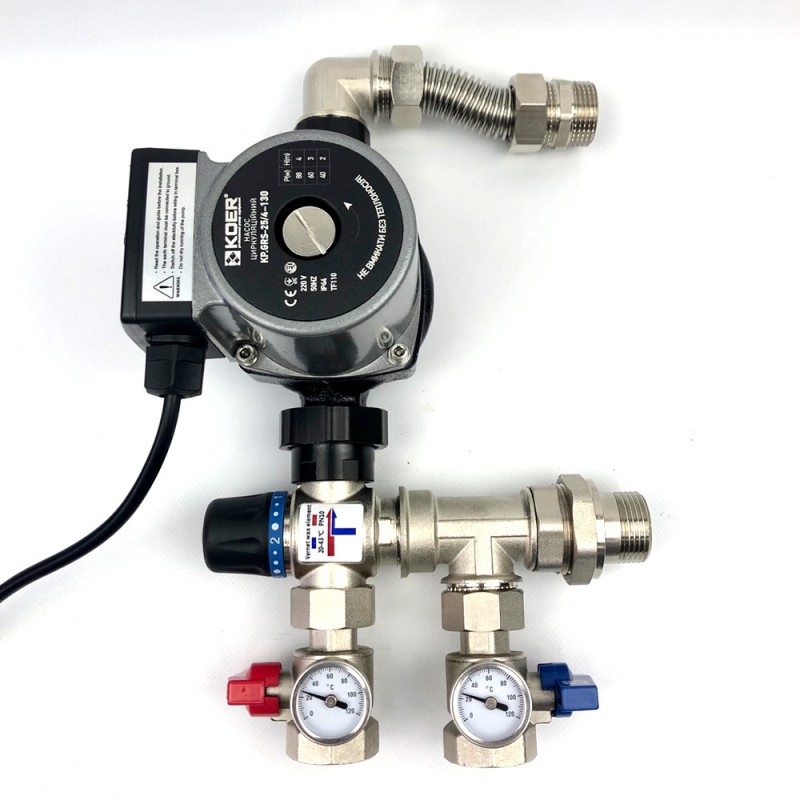 Компактний змішувальний вузол для теплої підлоги FLOMIX Т 25.40 KR застосовується для регулювання температури теплоносія, який подається в систему теплої підлоги. Його універсальна конструктивна форма дозволяє встановити його з будь-якої сторони розподільчого колектора і має універсальне гнучке міжосьове підключення , яке практично підходить для всіх виробників колекторів . Зручне нижнє підключення трубопроводів і швидке підключення нержавіючим металорукавом до колектору теплої підлоги. Змішувальний вузол оснащений запірними кранами з термометрами для вимірювання температури теплоносія, класичним циркуляційним насосом KOER 25/40 ( Hmax=4м) та термостатичним регулюючим клапаном з регулюванням температури теплої підлоги від 20-43 С та витратою 2,5 м.куб за годину для зміщування температури гарячої подачі з холодною зворотною лініями теплоносія. Усі елементи, з яких складається змішувальний узел попередньо герметично зібрані, відповідають усім міжнародним вимогам якості.