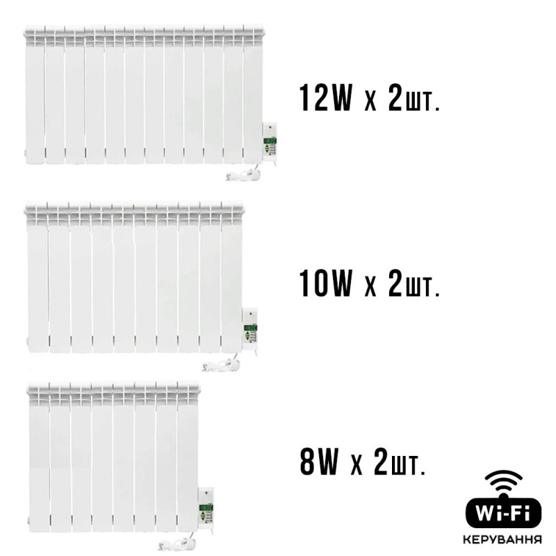 Розрахована на площу 84-96 м.кв з конфігурацією площі кімнат (20+20+16+16+12+12 м.кв) на шість електрорадіаторів ELECTRO серії W/Wi-Fi таких типорозмірів посекційно (12W/12W/10W/10W/8W/8W) з потужністю (1300+1300+950+950+910+910 Вт/г) Підключення до звичайної розетки 220В, ККД до 100%.