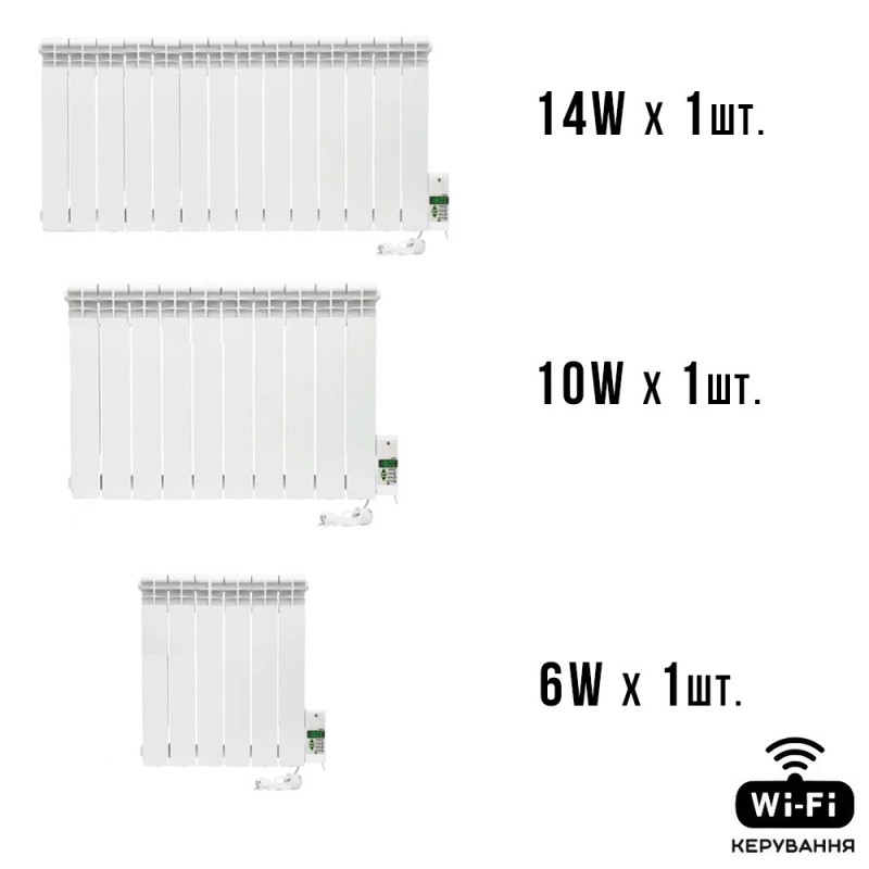 Розрахована на площу 42-48 м.кв з конфігурацією площі кімнат (24+16+8 м.кв) на три електрорадіатори ELECTRO серії W/Wi-Fi таких типорозмірів посекційно (14W/10W/6W) з потужністю (1500+950+650 Вт/ч). Підключення до звичайної розетки 220В, ККД до 100%.