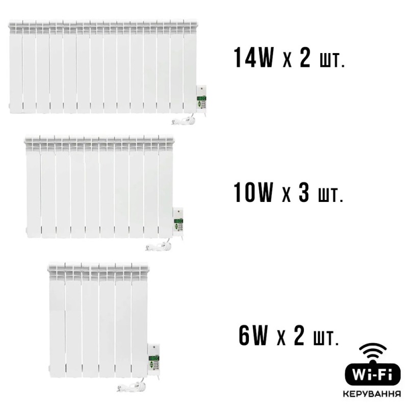 Розрахована на площу 100-112 м.кв з конфігурацією площі кімнат (24+24+16+16+16+8+8 м.кв) на сім електрорадіаторів ELECTRO серії W/Wi-Fi таких типорозмірів посекційно (14W/14W/10W/10W/10W/6W/6W) з потужністю (1500+1500+950+950+950+650+650 Вт/г) Підключення до звичайної розетки 220В, ККД до 100%.