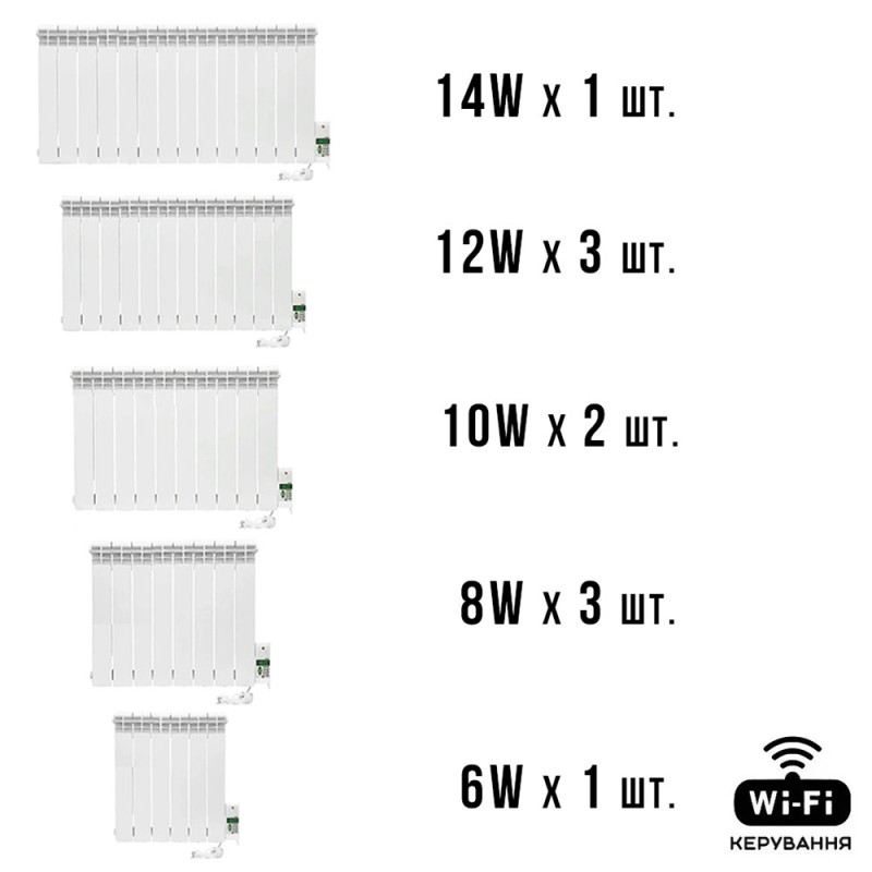 Розрахована на площу 145-160 м.кв з конфігурацією площі кімнат (24+20+20+20+16+16+12+12+12+8 м.кв) на дес'ять електрорадіаторів ELECTRO серії W/Wi-Fi таких типорозмірів посекційно (14W/12W/12W/12W/10W/10W/8W/8W/8W/6W) з потужністю (1500+1300+1300+1300+950+950+910+910+910+650 Вт/г) Підключення до звичайної розетки 220В, ККД до 100%.