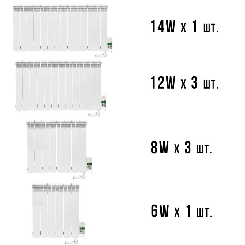 Наприклад ,ELECTRO SET 20 система опалення що складається зі 20 секцій біметалевих радіаторів зібраних в 2 електорадіатора загальною потужністю 2000 Вт. Розраховані цей комплект радіаторів на опалення приміщення з двох кімнат загальною площею від 28-32 м.кв з висотою стель 2.5м