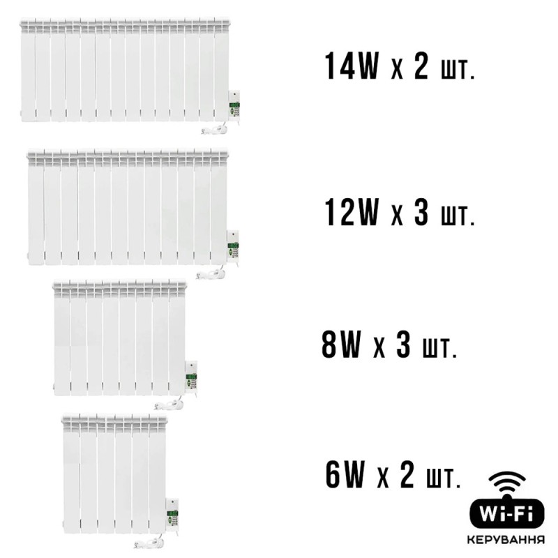 Наприклад ,ELECTRO SET 20 система опалення що складається зі 20 секцій біметалевих радіаторів зібраних в 2 електорадіатора загальною потужністю 2000 Вт. Розраховані цей комплект радіаторів на опалення приміщення з двох кімнат загальною площею від 28-32 м.кв з висотою стель 2.5м