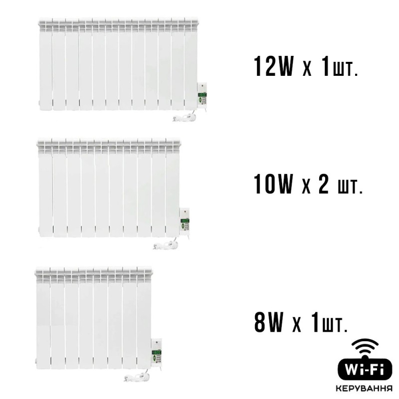Наприклад ,ELECTRO SET 20 система опалення що складається зі 20 секцій біметалевих радіаторів зібраних в 2 електорадіатора загальною потужністю 2000 Вт. Розраховані цей комплект радіаторів на опалення приміщення з двох кімнат загальною площею від 28-32 м.кв з висотою стель 2.5м