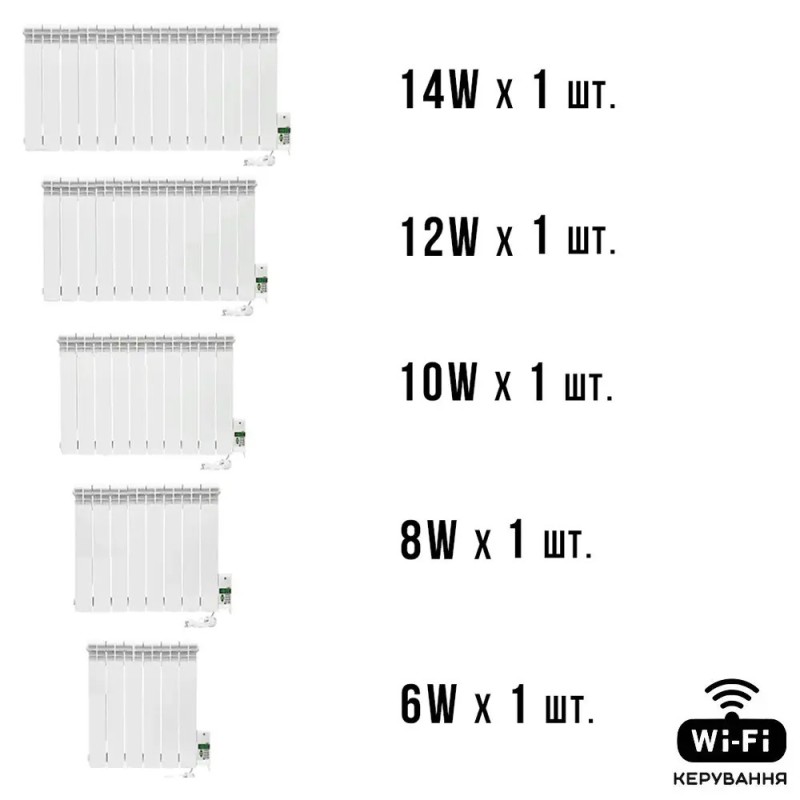 Розрахована на площу 70-80 м.кв з конфігурацією площі кімнат (24+20+16+12+8 м.кв) на п'ять електрорадіаторів ELECTRO серії W/Wi-Fi таких типорозмірів посекційно (14W/12W/10W/8W/6W) з потужністю (1500+1300+950+910+650 Вт/ч). Підключення до звичайної розетки 220В, ККД до 100%.