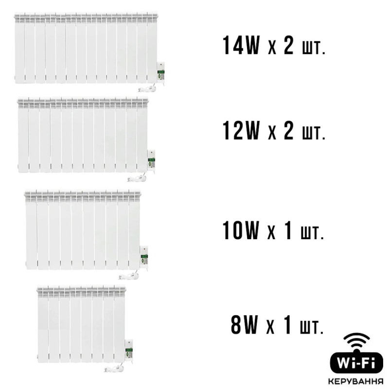 Наприклад ,ELECTRO SET 20 система опалення що складається зі 20 секцій біметалевих радіаторів зібраних в 2 електорадіатора загальною потужністю 2000 Вт. Розраховані цей комплект радіаторів на опалення приміщення з двох кімнат загальною площею від 28-32 м.кв з висотою стель 2.5м