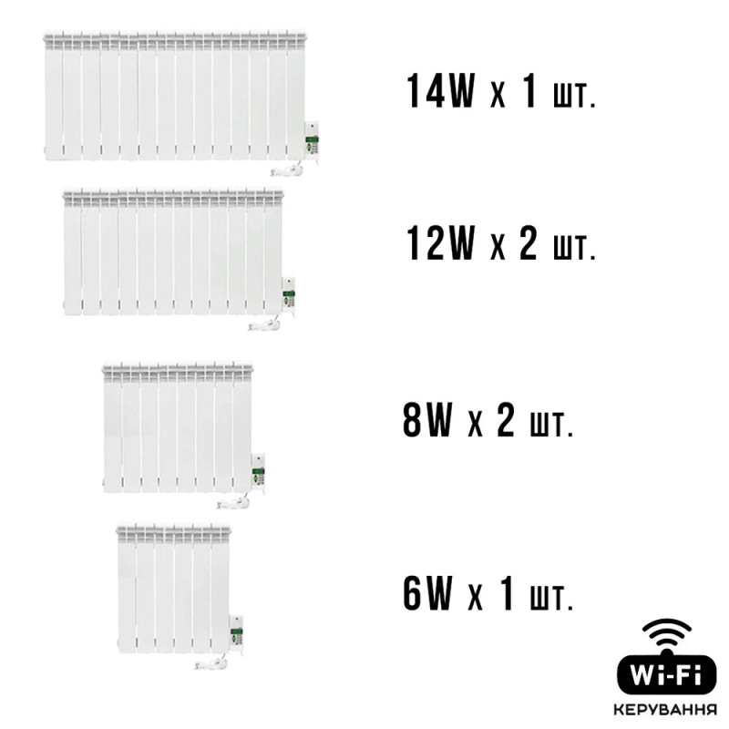 Розрахована на площу 84-96 м.кв з конфігурацією площі кімнат (24+20+20+12+12+8 м.кв) на шість електрорадіаторів ELECTRO серії W/Wi-Fi таких типорозмірів посекційно (14W/12W/12W/8W/8W/6W) з потужністю (1500+1300+1300+910+910+650 Вт/г) Підключення до звичайної розетки 220В, ККД до 100%.
