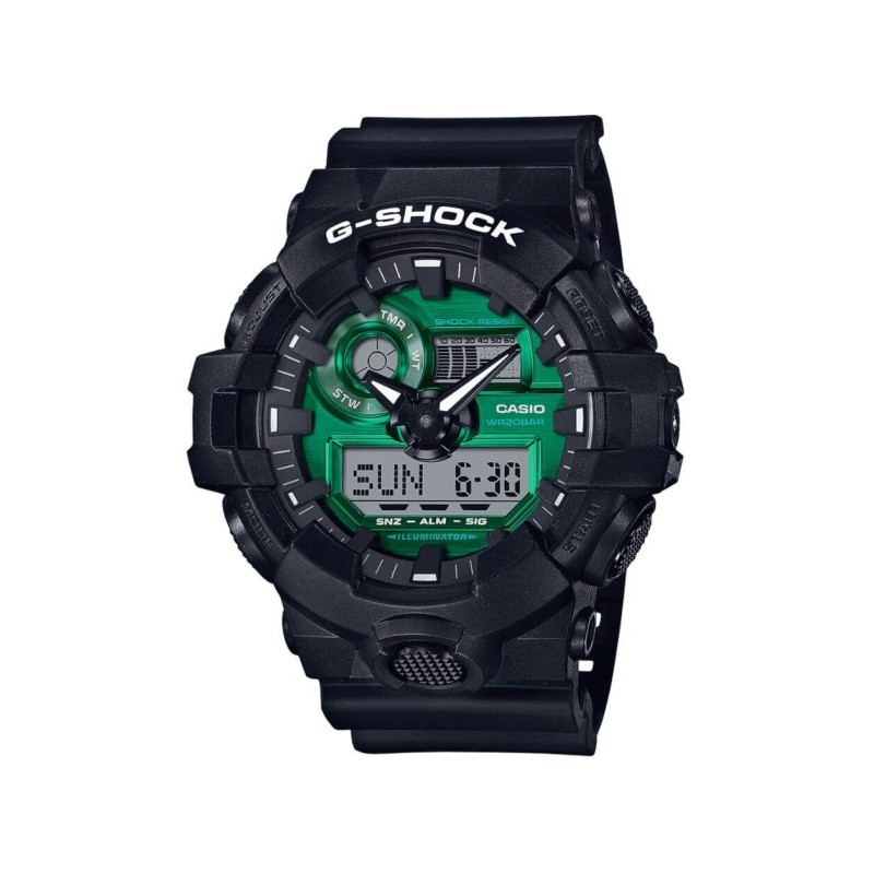 Чоловічий годинник Casio G-shock GA-700MG-1AER зберегли яскравий чорний колір, а їх відмітним елементом є зелений циферблат. Підсвічування можлива завдяки опції Super-Illuminator, для якої характерно яскраве світіння.