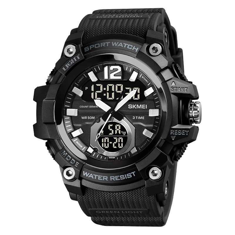 Потужні і брутальні SKMEI 1725 виглядають масивно і розлого. Такий аксесуар буде чудово виглядати на чоловічій руці, надаючи образу мужності. Годинник повністю чорного кольору, лише світлі цифри та мітки злегка відтіняють циферблат на загальному тлі. В годинниках поєднано два формату відображення часу - аналоговий та цифровий, це зручно для людей хто часто їздить у відрядження або спілкується з друзями або колегами проживають в інших годинних поясах.