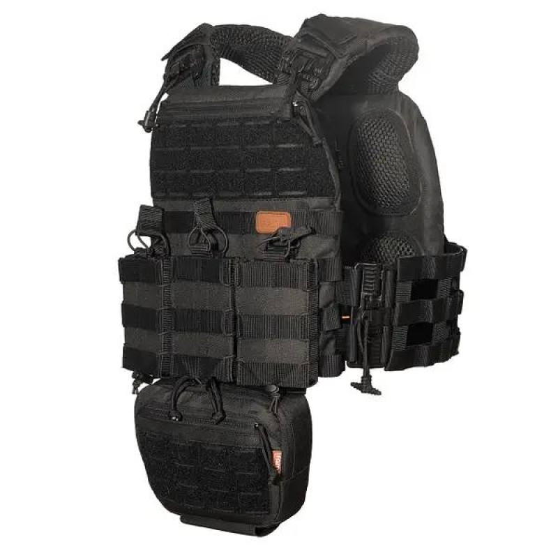 Тактический жилет дополнен 3 подсумками под магазин, подсумком под гранату, подсумком под аптечку, подсумком под сброс, напашником и системой Молли.