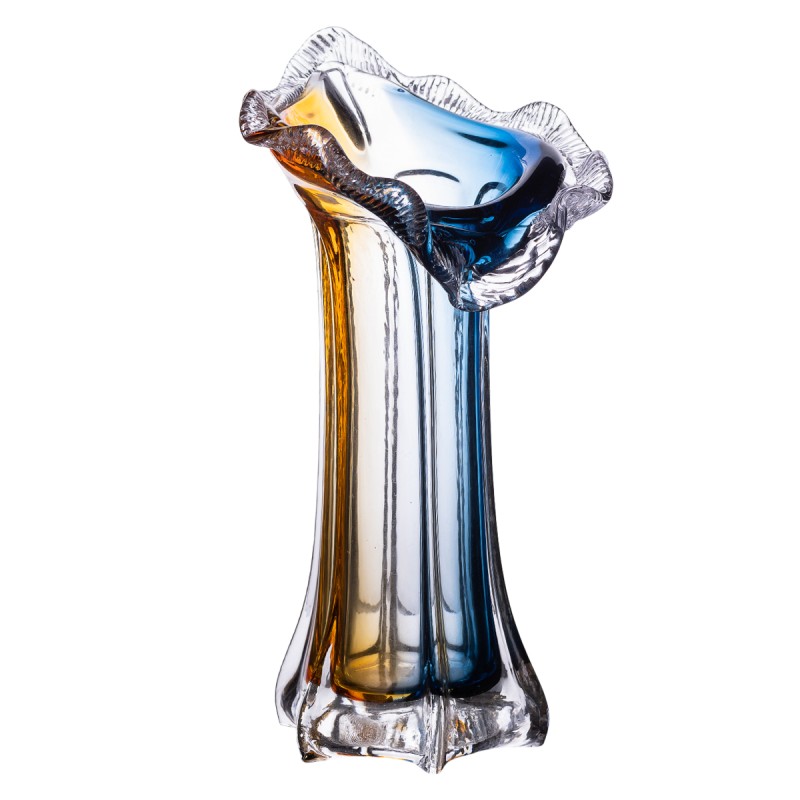Скляна ваза Crystal Coast ручної роботи – це вишуканий елемент декору, що поєднує у собі витончені лінії та гру кольорів. Виготовлена зі скла, вона має плавний перехід від золотистих до синіх відтінків, що надає їй оригінального вигляду. Завдяки ручному виробництву кожен виріб унікальний, що робить цю вазу особливою деталлю будь-якого інтер’єру.