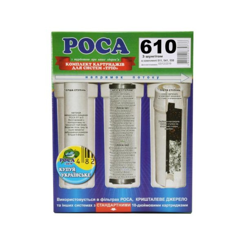 Комплект змінних картриджів призначений для очищення питної води. Використовується в трехкорпусних фільтрах "Роса" та фільтрах інших виробників. Забезпечує глибоке очищення води від хлору, органічних сполук і інших домішок. Включає картриджі, необхідні для повного циклу очищення: на першому місці картридж механічної очистки Роса 511, який забезпечує видалення піску, іржі та інших механічних забруднень, на другому картридж з пресованого вугілля Роса 541 для попередньої сорбційної очистки та на третьому - картридж Роса 558, який м істить високоякісне активоване вугілля з шкаралупи кокосового горіха та шунгіт. При взаємодії з водою шунгіт: структурує її і робить біологічно активною, очищає від шкідливих домішок (нітрати, нітрити, важкі метали, хлорорганічні сполуки, колоїдне залізо водопровідних труб, пестициди, діоксини, феноли, нафтопродукти, радіонукліди, бактерії, віруси), насичує організм корисними макро- і мікроелементами і поглинає шкідливі елементи, надає воді бактерицидну і антиоксидантну дію.