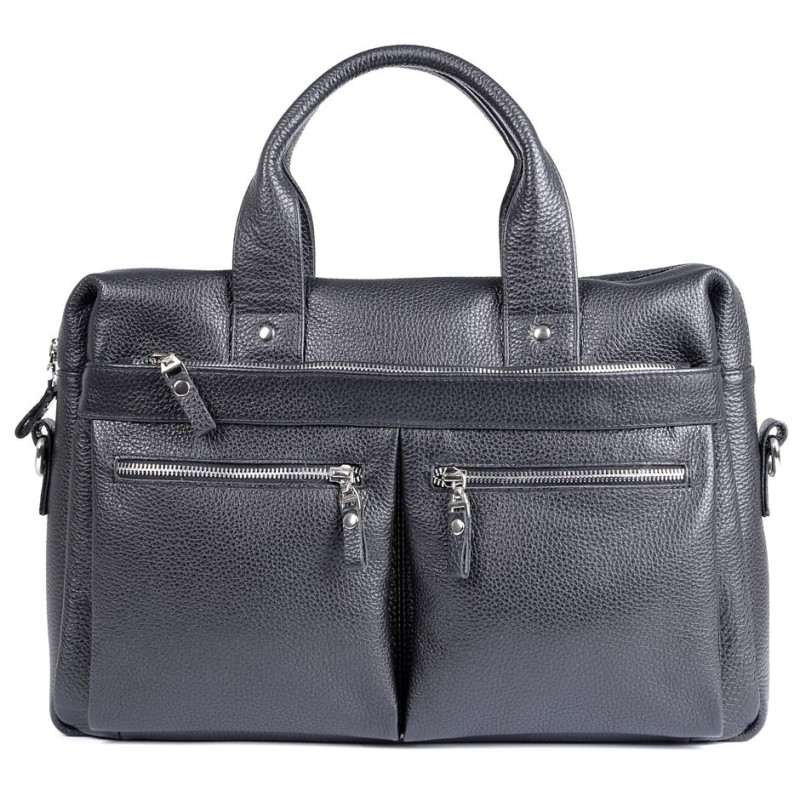 Країна виробництва: Україна. p style = text-align: justify; >Високоякісна чоловіча сумка із відділенням для невеликого ноутбука. Аксесуар виконаний з натуральної приємної на дотик шкіри чорного кольору. На лицьовій стороні цього виробу розташовано одне відділення і дві кишені на блискавках. На задній зовнішній стороні знаходиться ще одне відділення на блискавці. Сумку можна переносити в руці за допомогою зручних шкіряних ручок, а також через плече (у комплекті знімний, регульований плечовий ремінь, який виконаний у комбінації текстильного матеріалу та натуральної шкіри). Колір фурнітури: срібло.