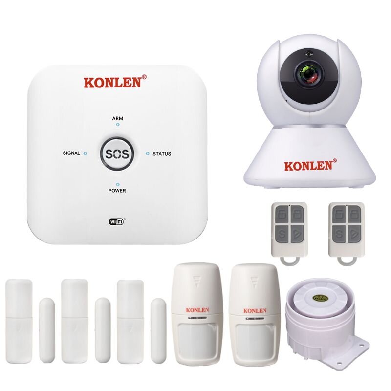 Професійна GSM WIFI сигналізація з WIFI камерою і додатком на смартфон GSM WiFi сигналізація KONLEN TUYA MAXI, повний комплект для дому та офісу + WiFi 1080p камера - дозволить не тільки захистити свій будинок від проникнення, але зручно отримувати інформацію про роботу системи на смартфон. Дана gsm wifi сигналізація для будинку поєднує в собі функції стандартної сигналізації, системи відеоспостереження та зручне управління за допомогою смартфона або планшета. До особливостей системи варто віднести високу якість виготовлення, наявність поворотної цифрової камери, стартовий набір датчиків і 2 канали передачі даних. Як і будь-яка система сигналізації, ця wifi gsm сигналізація призначена для охорони приміщення і попередження про проникнення на об'єкт, що охороняється або територію. Gsm wifi сигналізація має можливість оповіщення як по SMS (GSM мережу і SIM карта оператора), так і через Інтернет (за допомогою WIFi мережі). Можливість подвійної, паралельної передачі інформації дає можливість гарантовано попередити Вас про вторгнення в приміщення, що охороняється, навіть якщо один з каналів глушиться. Wifi gsm сигналізація призначена для установки усередині приміщення, установка датчиків або централі поза приміщенням може привести до їх виходу з ладу (не гарантійний випадок). Загальний принцип роботи системи простий: в приміщенні, що охороняється встановлюються датчики які при детектуванні вторгнення передають на централь сигнал тривоги (бездротовим шляхом). Централь приймає сигнал датчиків і піднімає тривогу, тобто включає сирену, а так само практично миттєво сповіщує Вас про тривогу в додатку або за допомогою SMS повідомлення. При всій удаваній складності, система надзвичайно надійна, при цьому проста у використанні і дозволяє розібратися в її роботі, не маючи практично жодних знань в електроніці, крім цього є інструкція, в якій все описано. Налаштування функціоналу всієї системи проводиться за допомогою зручного додатку, яке повністю і добре русифікований. Незважаючи на те, що датчики з комплекту вже прив'язані до централі, загальний час налаштування системи з нуля займає не більше 3 хвилин. Комплект gsm wifi сигналізації складається з централі, поворотної камери, 2 датчиків руху, 3 датчиків відкриття (дверей / вікон), 2 брелків (для постановки / зняття з сигналізації), сирени і адаптера живлення для централі. Такого «стартового» набору цілком вистачає для обладнання кімнати, квартири або невеликого офісу, однак при необхідності кількість датчиків системи можна збільшити, додатково прив'язавши інші (сумісні) датчики будь-якого типу, що працюють на частоті 433 МГц. Принцип роботи датчиків кожного типу датчиків стандартний. Датчики передають сигнал на централь бездротовим шляхом, а максимально відстань між датчиками і централлю, становить не більше 100 м (при прямої видимості). Живлення датчиків і брелків автономне від лужних батарейок або акумуляторних батарей, заряду яких вистачає зазвичай на 4-6 місяців роботи. Живлення централі від електричної мережі через адаптер живлення. Для безперебійної роботи централі, в ній є невеликий акумулятор забезпечує роботу системи до 12 годин. Камера з системи так само живиться від мережі через адаптер живлення. Камера має сенсор на 2MP і підтримує роздільну здатність 1920х1080 пікселів. Фокусна відстань становить 3,6 мм, що дає статичний кут 