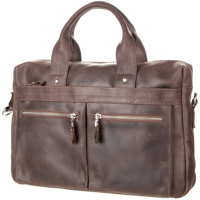 Ексклюзивна і надійна сумка виготовлена з натуральної шкіри, яка зветься «crazy», для неї характерні потертості і неоднорідність забарвлення. Виріб надійно прошито надміцною ниткою, все зроблено якісно та акуратно. На лицьовій стороні сумки розташовані дві невеликі симетричні кишені на блискавці, а також відділення на блискавці. На задній зовнішній стороні знаходиться прихована кишеня на блискавці. Основне відділення закривається блискавкою кольору срібла. Переносити цей аксесуар можна в руці, а також через плече за допомогою плечового ременя, яким укомплектована сумка.