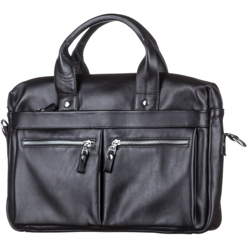 Красива чоловіча сумка з відділенням для невеликого ноутбука, а також документів формату А4. Аксесуар виконаний із натуральної гладкої шкіри чорного кольору. На лицьовій стороні цього виробу розташовано одне відділення і дві кишені на металевих блискавках. На задній зовнішній стороні знаходиться ще одне відділення на блискавці. Сумку можна переносити в руці за допомогою зручних шкіряних ручок, а також через плече (у комплекті знімний, регульований плечовий ремінь, який виконаний у комбінації текстильного матеріалу та натуральної шкіри). Колір фурнітури: срібло.