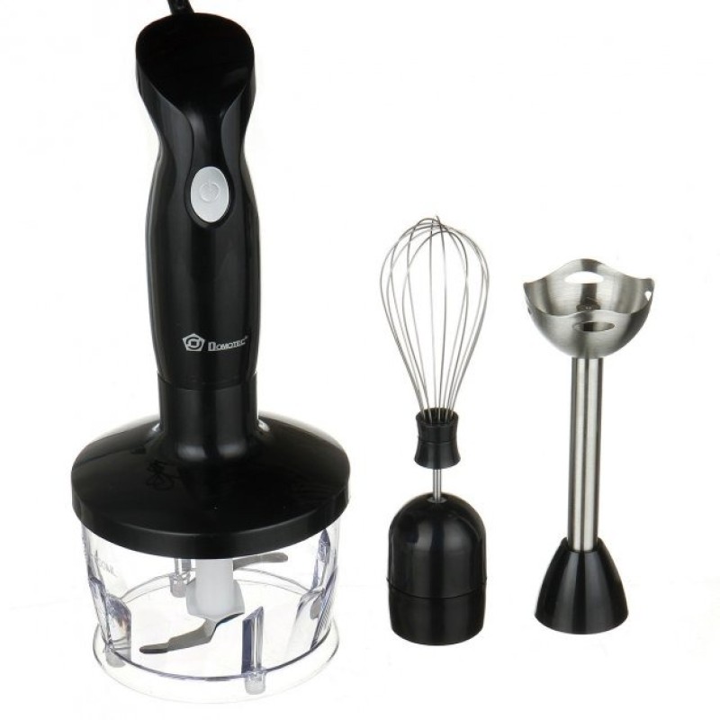 У комплектації передбачені блендер, віночок для збивання та міні-подрібнювач. Всі ножі та ніжки виробів зроблені з якісної нержавіючої сталі, їх корпуси – пластикові. Насадки легко знімаються і швидко миються. Блендер Domotec – це добротний функціональний прилад. Тепер для Вас не важко приготувати, наприклад, крем-суп, овочеве або фруктове пюре для вашої дитини або крем для улюбленого торта.