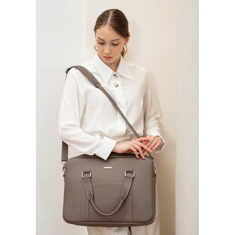 Шкіряна сумка має відділення для ноутбука, яке фіксується кнопкою. Також додаткова кишеня на блискавці для документів і дві невеликі кишені для дрібниць. Ще одна кишеня на блискавці розташована зовні сумки.