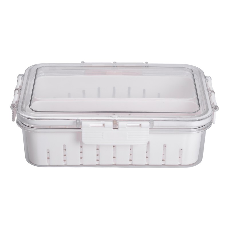 Пластиковий контейнер для зберігання розміром 23.5*17*7 см призначений для організованого зберігання овочів, фруктів, зелені або дрібних продуктів харчування в холодильнику. Його прямокутна форма забезпечує зручне розміщення на полицях, а прозорі стінки дозволяють бачити вміст без необхідності відчиняти кришку. Контейнер обладнаний двома окремими гратчастими секціями, які забезпечують циркуляцію повітря навколо продуктів та запобігають накопиченню вологи. Роздільні секції дозволяють зберігати різні продукти одночасно, не змішуючи їх між собою. Завдяки ґратчастій основі продукти не лежать у воді, що позитивно впливає на термін їхньої свіжості. Така конструкція ідеально підходить для холодильного зберігання попередньо вимитих ягід, листової зелені, порізаних овочів чи фруктів. Контейнер виготовлений із міцного пластику, стійкого до низьких температур, легко миється, підходить для багаторазового використання. Простий у догляді та практичний у щоденному використанні – допомагає підтримувати порядок та чистоту на полицях холодильника.