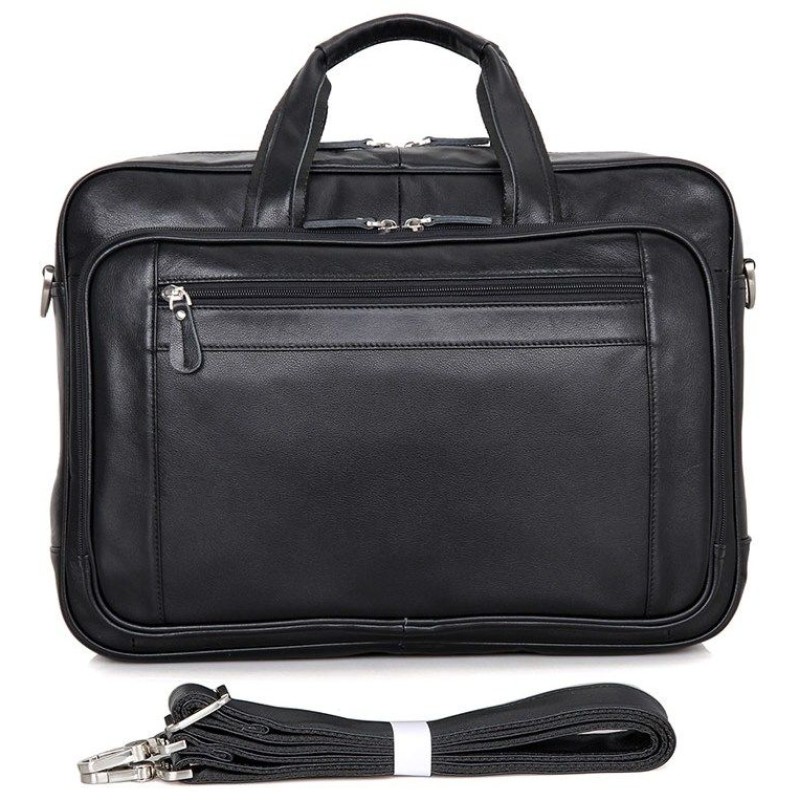 Елітна чоловіча сумка для ноутбука до 17 дюймів. Аксесуар виконаний із натуральної високоякісної шкіри чорного кольору. Колір фурнітури: срібло. Переносити цю модель можна в руці або через плече (у комплекті знімний, регульований плечовий ремінь). На лицьовій стороні розташована потайна кишеня на блискавці, а також величезне відділення на блискавці в якому Ви знайдете:
