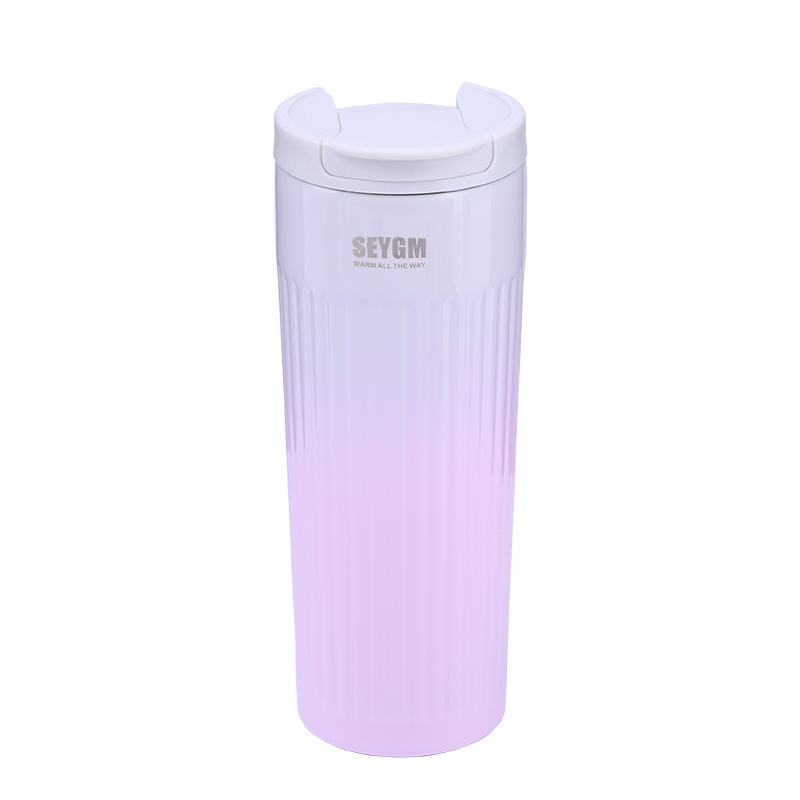 Термокружка об'ємом 500 мл - ідеальний аксесуар для тих, хто хоче завжди мати під рукою улюблений гарячий напій. Кружка вирізняється стильним дизайном, напівпрозорий пастельний градієнт надає їй певної чарівності та вигідно вирізняє з-поміж інших термокружок. Такий термос можна взяти з собою на роботу і в поїздку, він сумісний з автомобільними підстаканниками і поміститься в дамську сумку або шкільний рюкзак. Крім того, завдяки рельєфному корпусу, він зручно "лягає" в руку. Термочашка виготовлена з високоякісної нержавіючої сталі, має гвинтову кришку з силіконовим ущільнювачем, що захищає від випадкових протікань. Кружка вирізняється подвійними стінками і герметичною конструкцією, кришка оснащена зручною засувкою, яка легко відкривається. Усі елементи легко розбираються для чищення та миття руками або в посудомийній машині. Зверніть увагу: Щоб уникнути появи неприємного запаху і утворення цвілі, термос і кришку з силіконовими ущільнювачами збирати тільки після повного висихання. Термін експлуатації термоса необмежений, якщо немає пошкоджень корпусу або колби. Щоб запобігти втраті герметичності та теплоізоляційних властивостей, не варто упускати термочашку, заливати в неї окріп і солодкі газовані напої. Категорично не рекомендується розігрівати чашку в мікрохвильовці та поміщати всередину тверді предмети.