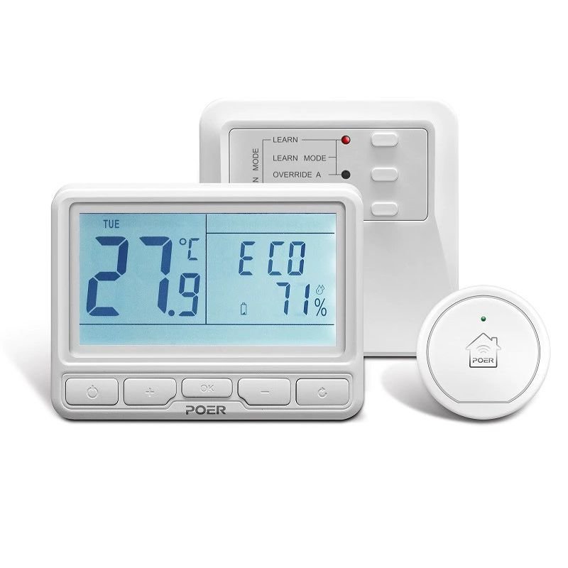 Керуйте опаленням в будинку зі смартфона через інтернет Інноваційний бездротовий термостат з wifi терморегулятором для котла і теплої підлоги від відомої американської компанії - виробника Poer, модель PTC-10WIFI допоможе Вам управляти Вашим газовим або електричним котлом опалення дистанційно - бездротовим шляхом і навіть через інтернет, а так само економити ваші гроші, за допомогою програмування графіка підтримки температури, знижуючи її днем, коли Ви на роботі і підвищуючи перед вашим приїздом і під час знаходження в будинку. Комплект містить Wifi шлюз, через який можна управляти термостатом через інтернет з вашого смартфона з будь-якої точки світу. Якщо у вас приватний будинок і в ньому стоїть автономна система опалення за допомогою газового або електричного котла - то весь цей комплекс обладнання повинен керуватись і періодично перенастроюватися в залежності від температури навколишнього середовища. Зазвичай, такі системи опалення встановлюються в підвальних або інших спеціальних приміщеннях і потрібно періодично до них ходити для збільшення або зменшення температури обігріву. Бездротовий терморегулятор wifi дозволить змінювати ці налаштування температури котла для опалення дистанційно, за допомогою бездротового інтерфейсу, перебуваючи при цьому в своїй кімнаті. Повністю відпадає необхідність ходити в котельню для переналаштування режиму роботи котла. Більш того, Ви можете запрограмувати даний wi-fi термостат для котла на підтримку постійної температури в будинку і в разі зниження температури на вулиці - він автоматично додасть температуру обігріву в котлі, щоб в будинку вона залишалася стабільно на одному рівні. Він має тижневий програматор. Коли протягом робочого дня будинок пустує, то він або опалюється весь день і через це перевитрачається газ або електроенергія, або якщо Ви виставили котел на мінімум перед повітом - то швидше за все ввечері повернетеся в охолоджений будинок і ще 1-2 години будите мерзнути , поки будинок не прогріється. Wi-fi терморегулятор дозволяє запрограмувати роботу котла так, щоб він почав нагрівати будинок за годину або інше необхідне час до вашого повернення і таким чином ввечері Ви вже повернетеся в теплий будинок. Складається кімнатний термостат wifi з 3-x частин: Передавача з блоком управління, LCD екраном, кнопками управління і датчиками температури і вологості. Приймача, який підключається безпосередньо до котла і управляє його роботою, а так само обмінюється інформацією з передавачем бездротовим шляхом по радіоканалу. Wifi шлюзу, який включається в розетку і дозволяє управляти котлом через інтернет за допомогою фірмового додатка для Iphone і Android смартфонів. Максимальна відстань між передавачем і приймачем, а так само між приймачем і wifi модулем не повинно перевищувати 100 метрів (без перешкод), або не більше 3-х стін. Інакше, бездротовий сигнал від передавача НЕ буде діставати до приймача., За оцінкою компанії POER, ви зможете заощадити до 45% на витратах на опалення, просто налаштувавши режими роботи системи. Основні особливості бездротового термостата - передавача Бездротове управління газовим або електричним котлом на відстані до 100 метрів. Незалежна пам'ять в передавачі і приймачі - це означає, що ваші налаштування та встановлені режими роботи збережуться навіть при раптовому відключенні елект