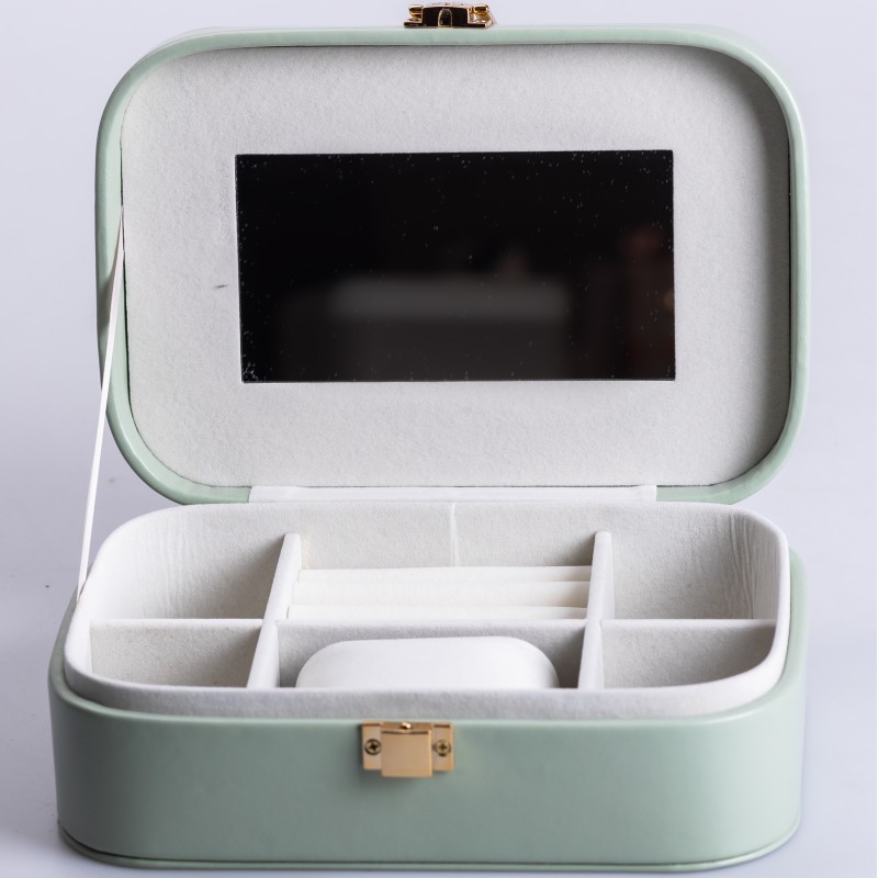 Скринька відрізняється жорстким корпусом, що захищає вміст від зовнішніх впливів. Зовнішнє покриття виготовлене з екошкіри, елементи фурнітури виготовлені з нержавіючої сталі з гальванічним покриттям. Органайзер доповнений дзеркалом у кришці, що робить його використання ще зручнішим. Скринька щільно закривається, є накидний замок, що запобігає випадковому відкриванню.