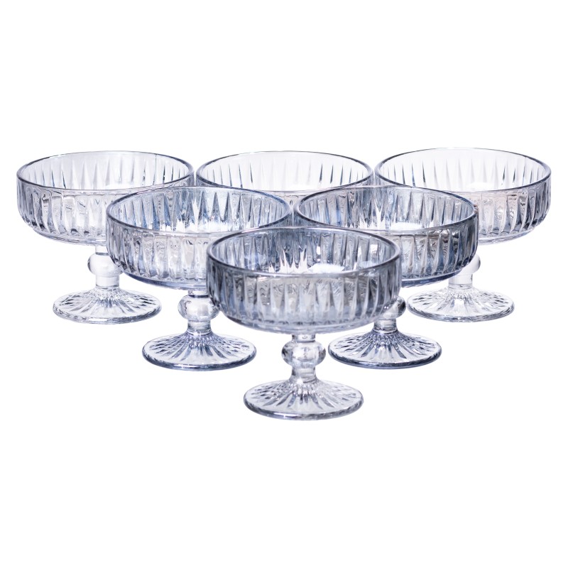 Набір креманок на ніжці з товстого прозорого скла призначений для подачі десертів, фруктових салатів, морозива та інших холодних страв. Завдяки універсальному формату, набір зручний як для щоденного використання, так і для сервірування столу під час урочистих заходів або свят. Кожна креманка має об'єм 300 мл, висоту 10 см, верхній діаметр 11 см і нижній - 7 см. Такі пропорції дозволяють комфортно розміщувати різні страви, зберігаючи їхній пристойний вигляд. Скло досить масивне, що забезпечує стійкість та зносостійкість при багаторазовому використанні. Загальна вага набору – 2,5 кг. Простий дизайн полегшує поєднання креманок з іншим посудом. Вони легко миються та не втрачають прозорості з часом. Набір із 6 штук підходить як для побуту, так і для невеликих закладів харчування.