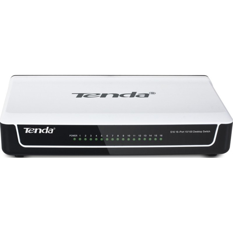 Tenda S16 – це 16-портовий Fast Ethernet комутатор. Він підтримує автовизначення MDI/MDI-X, NWAY-автоузгодження та функцію запам'ятовування/старіння MAC-адрес, таблицю MAC адрес на 4000 записів. У неблокуючому повнодуплексному режимі максимальна швидкість може досягати 200 Мбіт/сек на порт, подвоюючи загальну пропускну здатність до 3.2 Гбіт/сек. S16 зводить до нуля колізії, дозволяючи вашій мережі працювати гладко навіть під час великого трафіку. S16 це Plug&Play комутатор зі стабільною продуктивністю та високою швидкістю маршрутизації.