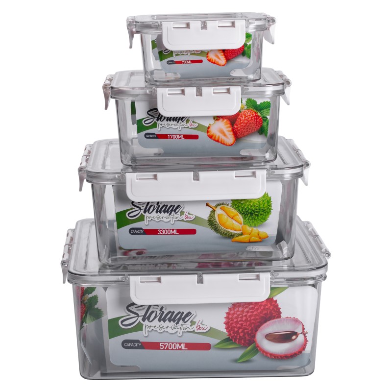 Набір із 4 пластикових контейнерів різного об'єму призначений для зберігання продуктів удома або в дорозі. Контейнери легко складаються один в один, що дозволяє економити місце зберігання. Герметичні кришки з фіксаторами щільно прилягають до корпусу, запобігаючи витіканню рідини та потраплянню сторонніх запахів. Кожен контейнер підходить для зберігання різних типів продуктів – від сипучих до готових страв. У наборі представлені контейнери об'ємом 5.7 літра, 3.3 літри, 1.7 літри та 0.7 літри. Завдяки різним розмірам їх зручно використовувати як окремо. Прозорі стінки дозволяють швидко оцінити вміст, а зручні фіксатори на кришках забезпечують безпечне перенесення. Контейнери легко миються, придатні для багаторазового використання та дозволяють підтримувати порядок у холодильнику, шафі чи сумці. Їх можна брати з собою на роботу, пікнік або зберігати вдома – практичність забезпечується варіативністю обсягів та компактним зберіганням.