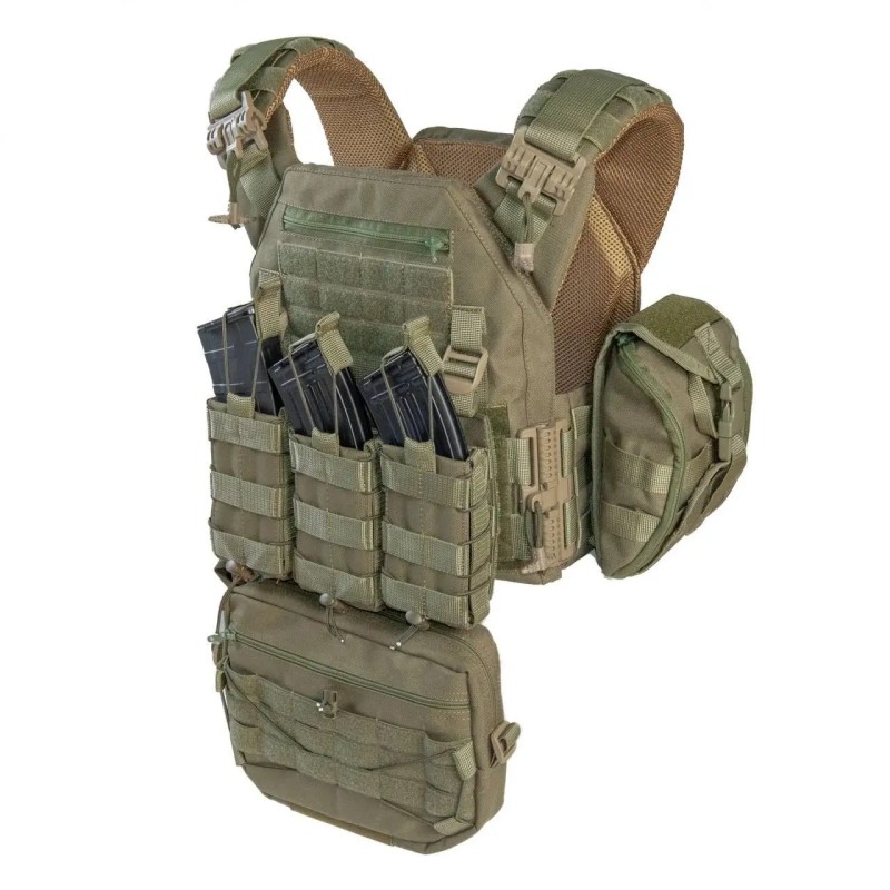 Захисний жилет - плитоноска можуть нести балістичні пластини стандартного розміру 250Х300мм, які якісно кріпляться подвійною фіксацією. Весь жилет обклеєний стрічками у камуфляжній системі MOLLE, що допускає будь-яку конфігурацію (підсумки під магазини, аптечку, сумку скидання тощо). На плічках є «підйомники», що дозволяють позиціонувати і фіксувати балістичні пластини по висоті. Боковини надійно тримаються на липучках і мають можливість вставки бічного протиосколкового пакета. Завдяки простій конструкції, заснованій на шести елементах - передній панелі, задній панелі, 2-х поясах, 2-х комфортних плічках і швидкознімній фурнітурі, що використовується, у користувача є можливість швидкого скидання жилета за 1 сек. Внутрішня частина жилету виконана дистанційною сіткою, що підвищує комфорт при носінні.
