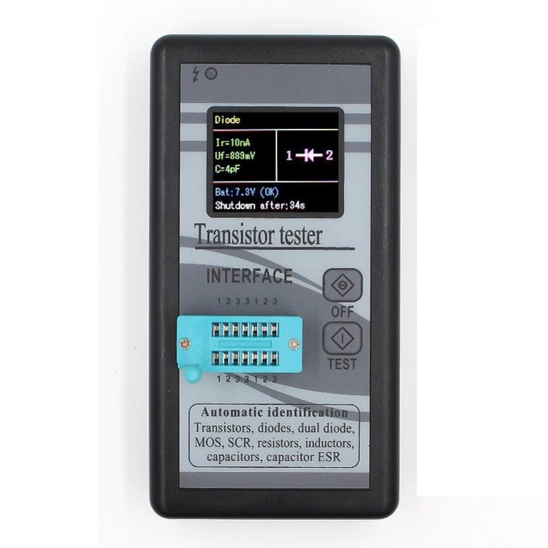 Універсальний тестер транзисторів, конденсаторів, радіодеталей і радіокомпонентів Для того, щоб провести випробування і вимірювання основних параметрів радіотехнічних деталей пропонуємо вам використовувати універсальний транзистор тестер для перевірки конденсаторів радіодеталей Fnirsi TT-128. Він призначений для перевірки основних типів радіодеталей - транзисторів типів MOS, SCR, MOSEFIT, діодів, резисторів, індукторів, конденсаторів, в тому числі з ESR. На відміну від інших аналогічних приладів цей вимірювач не потрібно налаштовувати. Визначення типу деталі і її основних параметрів відбувається автоматично, що економить ваш час і не вимагає спеціалізованих знань. Універсальний транзистор тестер має компактний пластиковий повноцінний корпус. Кольоровий дисплей тестера 160 х 128 пікселів слугує для виведення результатів і має відмінну інформативність, відображає цифрові значення вимірювання і графічну схему деталі. На екран також виводяться заряд батарейки і час до автоматичного відключення. Провести тест ви можете за допомогою всього лише двох кнопок на передній панелі, одна включає живлення і запускає тестування, друга - вимикає прилад. Для випробування тестований елемент закріплюється в пронумерованій панелі так, щоб його виводи виявилися під різними номерами. Зверніть увагу, що в тестері немає відображення результатів вимірювань в реальному часі, для перевірки наступної деталі вам необхідно змінити деталь і натиснути знову кнопку тесту. При перевірці транзисторів ви зможете визначити не тільки його основні параметри, але і вид, а також розташування колектора, бази і емітера, його структуру. Можливо протестувати також здвоєні діоди і світлодіоди, в тому числі двоколірні. За допомогою даного тестера потенціометри, високовольтні діоди і стабілітрони протестувати не можна, схема приладу не розрахована на їх перевірку. Для живлення тестера потрібна батарейка типу "Крона" 9 В. Основним мінусом даного тестера радіодеталей є його високе енергоспоживання, що визначено специфікою роботи і процесом перевірки. Для економії заряду передбачений процес автоматичного відключення через 40 секунд бездіяльності. Транзистор тестер слід купувати для допомоги в роботі фахівців з ремонту побутової та електронної техніки, радіоаматорів, на виробництві електронних приладів. Він дуже простий у використанні, не вимагає складних налаштувань і інструкцій по експлуатації. Основні особливості і характеристики Універсальний простий тестер радіодеталей в компактному пластиковому корпусі. Підходить для перевірки транзисторів різних типів, діодів, світлодіодів, резисторів, котушок індуктивності, діодів, конденсаторів і їх ESR. Не застосовується для перевірки високовольтних діодів, стабілітронів та потенціометрів. Автоматичне визначення типу деталі та відсутність складних налаштувань. Висновок всієї інформації про параметри компонента та його структурної схеми виводяться на кольоровий дисплей. Висока витрата живлення в процесі роботи, обумовлена особливостями роботи. Технічні характеристики тестера радіодеталей: Перелік тестованих компонентів: транзистори (MOS, SCR, MOSEFIT, польові), діоди, світлодіоди, резистори, індуктори (котушки індуктивності), конденсатори (в тому числі ESR).Дисплей: 1,8 "TFT, кольоровий. Струм: 20 мА. Діапазон випробування резис