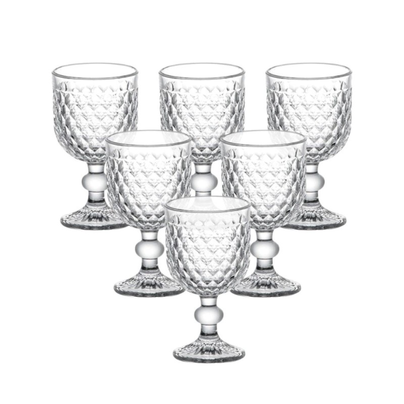 Набір чарок для напоїв включає 6 штук із кришталевого скла, кожна об'ємом 50 мл. Вироби мають прозору фігурну форму з декоративними згинами у формі ромбів, які створюють рельєфну фактуру та візуально підкреслюють чистоту матеріалу.