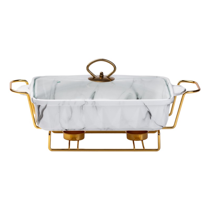 Перетворіть кожну трапезу на справжню подію з нашою елегантною керамічною мармітницею. Ця прямокутна мармітниця об'ємом 1,5 л виготовлена з високоякісної кераміки білого кольору з витонченим мармуровим ефектом, що надає їй розкішного вигляду та сучасного стилю. Її класичний дизайн легко вписується в будь-який інтер'єр, додаючи нотку вишуканості до вашого столу. Золотиста металева підставка з підігрівом не тільки підкреслює елегантність мармітниці, але й забезпечує зручність та функціональність. Вона дозволяє підтримувати страви гарячими протягом тривалого часу, що особливо важливо під час довгих обідів чи святкових заходів. Ваша їжа завжди буде теплою та апетитною, що сприятиме приємній атмосфері за столом. Скляна кришка, що входить до комплекту дозволяє зручно спостерігати за процесом приготування чи нагрівання. Кожна деталь мармітниці продумана до дрібниць, що робить її ідеальним вибором для тих, хто цінує як функціональність, так і стиль. Характеристики: Розміри: 35*19*11.5 см Вага: 2.160 кг Об'єм: 1.5 літри Матеріал: кераміка, скло, нержавіюча сталь