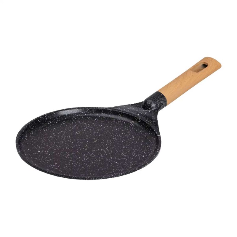 Завдяки низьким бортам можна легко перевертати млинці, а товщина дна 5 мм забезпечує рівномірний розподіл тепла та стабільність при використанні на різних типах плит. Сковорода підходить для використання на газових, індукційних та електричних плитах, що робить її універсальним вибором для будь-якої кухні.