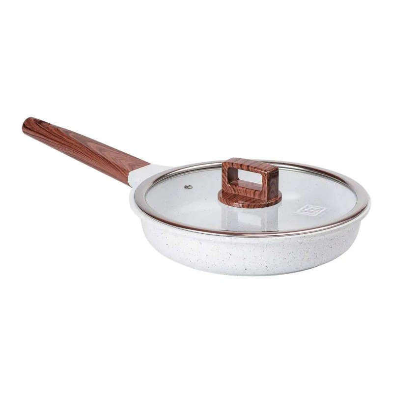 Сковорода діаметром 24 см - універсальний варіант для приготування невеликих порцій їжі. Посуд виготовлений з литого алюмінію, добре проводить тепло і забезпечує рівномірне приготування. Сковорода має антипригарне керамічне покриття, завдяки чому можна готувати страви з мінімальною кількістю олії, а гладка внутрішня поверхня полегшує миття. Для зручності використання посуд має бакелітову ручку, яка не нагрівається та мінімізує ймовірність отримання опіків.