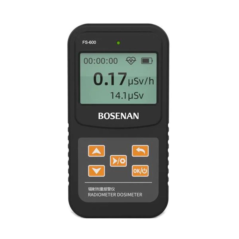 Компактний побутовий дозиметр для вимірювання рівня радіоактивності Дозиметр радіометр побутовий, лічильник гейгера - прилад для вимірювання радіації Bosean FS-600 є найкращим рішенням для контролю радіаційного випромінювання в побуті та в промисловості, а також коли вам потрібно використовувати компактний і точний пристрій. Цей індивідуальний дозиметр - радіометр вимірює гама, бета та рентгенівське випромінювання до максимального значення в 10 мкЗв/год з похибкою не більше 10%. Детектор радіації відрізняється високою чутливістю та гарною реакцією на різку зміну рівня радіації, ним можна швидко та точно визначити рівень радіації від об'єкта або знайти джерело випромінювання. Індивідуальний дозиметр - детектор радіації Bosean FS-600 має компактні розміри, виготовлений з якісної, міцної пластмаси, що не ковзає, що зручно при використанні в польових умовах. Дозиметр виводить показники вимірювань на РК-дисплей з підсвічуванням, як і індикатор заряду батареї. Ви можете переключити відображення даних між стандартним значенням у вигляді цифр та гістограмою. У стандартному відображенні відображаються 2 показники: рівень радіаційного випромінювання в реальному часі та загальна отримана доза за час вимірювання. Усі показники виводяться у мікрозивертах. Основними особливостями дозиметра є: наявність підсвічування екрану, 2 види живлення: через USB від блоку живлення або power bank 5 вольт або від 3-х батарей ААА, яких вистачає на 5-6 годин безперервної роботи. З налаштувань дозиметра вам доступні встановлення порога сигналу тривоги від 0,01 мікрозиверта до 9,99 зіверта на годину, увімкнення та вимкнення підсвічування. Зверніть увагу, що для відображення коректних даних дозиметр повинен працювати протягом хвилини після включення. Основні функції та особливості Вимірює X-Ray (рентгенівське випромінювання), β (Бета), γ (Гамма) випромінювання. Відображення на LCD екрані показання рівня випромінювання в реальному часі та отримана доза за час вимірювання, відображення у вигляді цифр або гістограми. Можливість встановлення та налаштування сирени у разі перевищення встановленого рівня радіації, як у реальному часі, так і загальної отриманої дози. Вимірювання проводиться за методом лічильника Гейгера і має похибку не більше 10%. Одночасно вимірює та відображає на екрані рівень радіаційного випромінювання в реальному часі та рівень отриманої дози радіації за весь час вимірювання. Поріг сигналу тривоги за потужністю дози та поріг сигналу тривоги за дозою можна плавно регулювати та встановлювати довільно. Можна переглянути дату початку вимірювання накопиченої дози радіації. Вбудована енергонезалежна пам'ять дозволяє накопичувати дані отриманої дози, а також зберігати налаштування рівня сирени і навіть після вимкнення дозиметра ці дані зберігатимуться. Відображення рівня заряду батарей на екрані. Увімкнення та вимкнення підсвічування екрана. Увімкнення та вимкнення звукового оповіщення USB type-C інтерфейс для підключення зовнішнього джерела живлення 5 вольт. Технічні характеристики Матеріал: пластик ABS. Вимірювані види випромінювання: Beta, Gamma, X-ray (рентгенівське). Тип сенсора: G-M трубка. Енергетичний діапазон: 50kev-1.5mev, менше 30%. Похибка виміру: менше 10%. Чутливість: 80cpm/μSV/Co-60. Діапазон вимірювання: 0.1μSv/h~10mSv/h. Максимальна отримана доза, що вимірюється: 10mSv/h. Звук