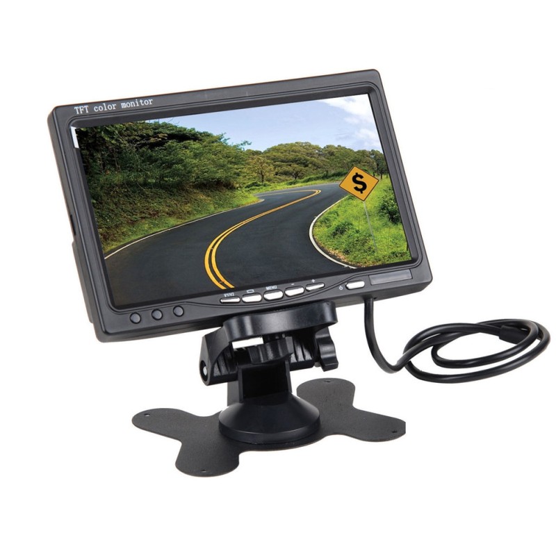 Недорогий автомобільний монітор 7 дюймів з 2-ма AV входами із кріпленням на торпедо Автомобільний монітор 7 дюймів Podofo R09 + - прекрасно слугуватиме як екран для камери заднього виду або камери відеоспостереження, встановленої в салоні автомобіля або автобуса. Завдяки наявності 2-х відео входів - Ви можете стаціонарно підключити до нього 2 різних камери або відеореєстратор для відтворення запису з нього і перемикатися між відео входами кнопкою на передній панелі. Цей автомобільний монітор має в комплекті стійку для кріплення на торпеду автомобіля або автобуса. Автомонитор має невеликий розмір корпусу - 171 х 115 х 32 мм, більшу частину передньої панелі займає LCD дисплей 7 дюймів. На передній панелі розташовані 5 кнопок управління і кнопка включення, а з задньої частини монітора виходить загальний провід, на кінці якого розташовано 2 роз'єми "тюльпан" для підключення камер або інших пристроїв з відеовиходом, а також роз'єм для підключення живлення. Висока роздільна здатність екрану 800х600 пікселів, в порівнянні з аналогами дає чітку і детальну картинку. В меню налаштувань також можна відрегулювати яскравість, контрастність, вибрати джерело відеосигналу та інші налаштування. Сам корпус зроблений з міцного пластику чорного кольору, на його задній стороні знаходиться роз'єм для стійки кріплення на торпедо, що йде в комплекті. Автомобільний монітор не має динаміків і аудіовходу - тому не може відтворювати звук. Автомобільний монітор підтримує відео стандарти PAL і NTSC, перемикання між якими відбувається автоматично. Також підтримується одночасне підключення 2-х джерел аналогового відеосигналу, наприклад автомобільної камери заднього виду і камери в салоні. Перемикання між ними відбувається за допомогою кнопки на панелі управління або пульта дистанційного керування. Управляти всіма функціями монітора можна як кнопками, так і за допомогою дистанційного пульта з комплекту. Живлення монітора передбачено від мережі через адаптер 12 В або від автомобільної електромережі з напругою 12 вольт. Якщо Ви хочете використовувати його в вантажному автомобілі або автобусі з напругою бортової мережі 24 вольта - то підключати монітор потрібно тільки через понижуючий трансформатор, інакше він може згоріти. Живлення пульта від батарейки типу CR2025. Основні особливості LED екран 7 дюймів, що підтримує роздільну здатність 800х600 пікселів. Наявність 2-х каналів для одночасного підключення різних джерел і можливість перемикання між ними. Міцний пластиковий корпус невеликої товщини з можливістю встановленняі на торпедо автомобіля. Регулювання кута нахилу. Управління функціями монітора і меню за допомогою кнопок на передній панелі і пульта дистанційного керування. Вбудований в корпус комплексний кабель 50 см, через який можна підключити живлення від бортової мережі, 2 джерела відеосигналу. Підтримка PAL і NTSC, автоматичний вибір стандарту. Живлення від мережі через адаптер 12 Вольт (в комплект не входить) або від електромережі автомобіля з напругою 12 вольта. Якщо Ви хочете використовувати його в вантажному автомобілі або автобусі з напругою бортової мережі 24 вольта - то підключати монітор потрібно тільки через понижуючий трансформатор. Короткий посібник з експлуатації Підключіть монітор за допомогою кабелю підключення з комплекту або за допомогою адаптера 12 В (в 