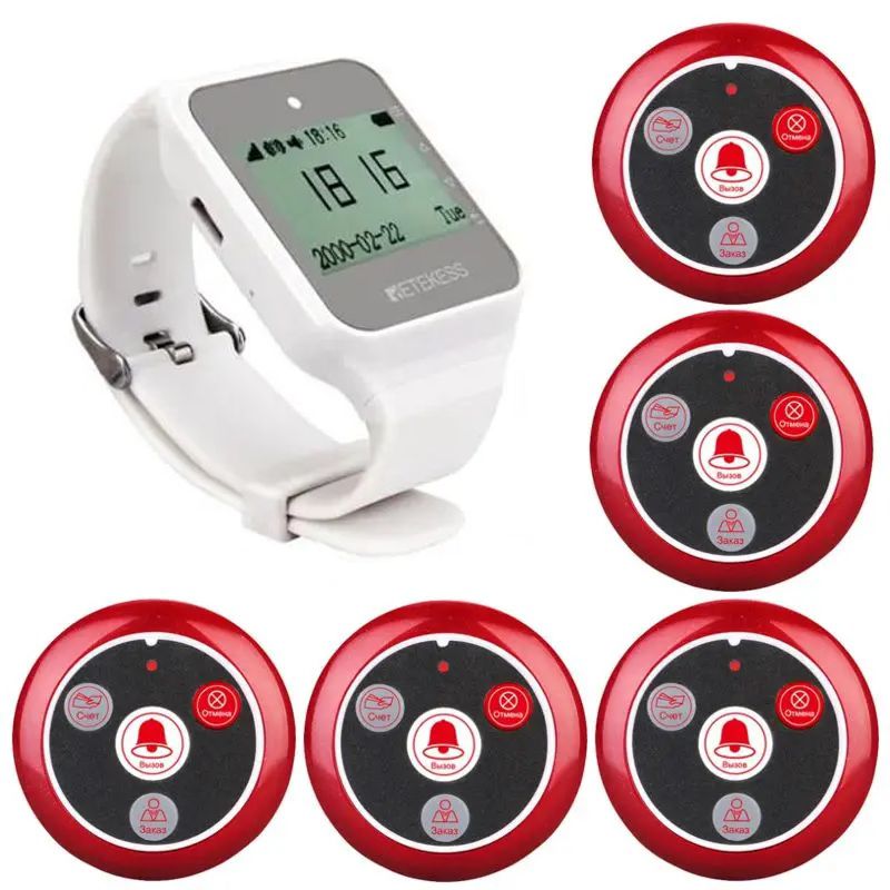 Бездротова система виклику офіціанта російською мовою Для організації якісного і швидкого обслуговування клієнтів в ресторані або кафе або для зручного виклику офіціанта клієнтом - була розроблена бездротова система виклику офіціантів Retekess TD109. З її допомогою ви зможете налагодити прямий зв'язок ваших клієнтів з персоналом, забезпечивши своєчасне прийом і виконання замовлень ваших відвідувачів. Головною особливістю даної системи є підписи кнопок виклику російською мовою і можливість вибору російської мови в годиннику офіціанта. Пейджингова система виклику офіціанта складає комплект з 5 кнопок з годинником - пейджером для прийому сигналів від бездротових кнопок. При натисканні кнопки виклику клієнтом, яка встановлюється на кожному столику - годинник повідомляють офіціанта або декількох офіціантів (при використанні декількох годин) звуком, вібрацією і / або світловою індикацією номер вхідного столика і типі виклику (звичайний виклик, рахунок або кальян). Підписи позначення Кнопов в годиннику можна міняти на інші значення з 20 варіантів. Меню для налаштування і роботи системи є російською мовою. Максимальна дальність передачі сигналу між кнопками і годинами становить до 80 метрів, що цілком достатньо в 99% випадків. До одним годинах - пейджера можна прив'язати до 999 кнопок, в тому числі і інших сумісних моделей. Так само одну кнопку можна прив'язати відразу до декількох годин. Залежно від організації роботи ваших офіціантів - можна закріпити конкретних офіціантів за конкретними столиками (кнопками виклику) або зробити, щоб все офіціанти обслуговували всі столики (всі отримують на годинник сигнал виклику, а обслуговує той, хто вільний у даний момент часу). Живлення годинника - пейджера передбачено від вбудованого акумулятора 500 мАг, якого вистачає при інтенсивній роботі на 2-3 доби. На дисплеї є індикатор заряду. Кнопки працюють від змінних батарейок типу CR3032, яких вистачить до 1 року роботи. Відмінність від інших аналогічних систем виклику полягає в тому, що 4 кнопки дозволяють не тільки передати сигнал, але і вказати офіціантові який саме вид дій збирається провести клієнт (зробити замовлення їжі, замовити кальян або попросити рахунок). До того ж меню системи має дуже гнучку настройку за видами виклику, що відображаються на екрані годин. Наприклад при натисканні кнопки можна замість "Офіціант", "Розрахунок" встановити вид виклику "Кава", "Вода" і т.д. Якщо система використовується наприклад в медичних установах. Ви можете навіть призначити певний вид виклику при одночасному натисканні на 2 або навіть три кнопки. Це дозволяє вам налаштувати даний комплект під абсолютно будь-які завдання. Основні особливості і характеристики Стандартна система виклику офіціанта полягає из 1 годин і 5 кнопок виклику. При необхідності, Ви можете докупити потрібну кількість додаткових кнопок виклику або годин. 3 види оповіщення на годиннику - звук, вібрація або миготіння світлом. Гнучка настройка видів оповіщення. Встановлення кількості повідомлень - 1,3 або 5 разів. Дальність передачі сигналу між кнопками і годинами - до 80 метрів. Робоча частота 433,92 МГц, дозволяє підключити додаткові кнопки будь-якого типу з відповідною частотою роботи. Підтримка до 999 кнопок. 4 клавіші на кнопці з російськими позначеннями: ""визов, счет, отмена, кальян" або "визов, сче