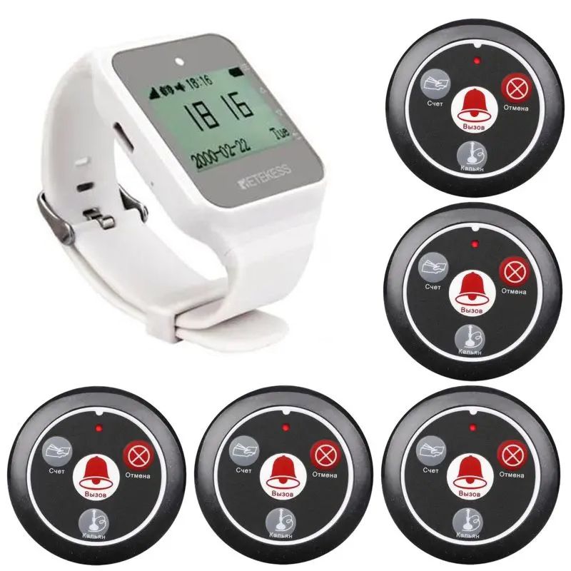 Система виклику офіціанта бездротова з білим годинником - пейджером Retekess TD108 + 5 чорних кнопок (з кнопкою КАЛЬЯН)