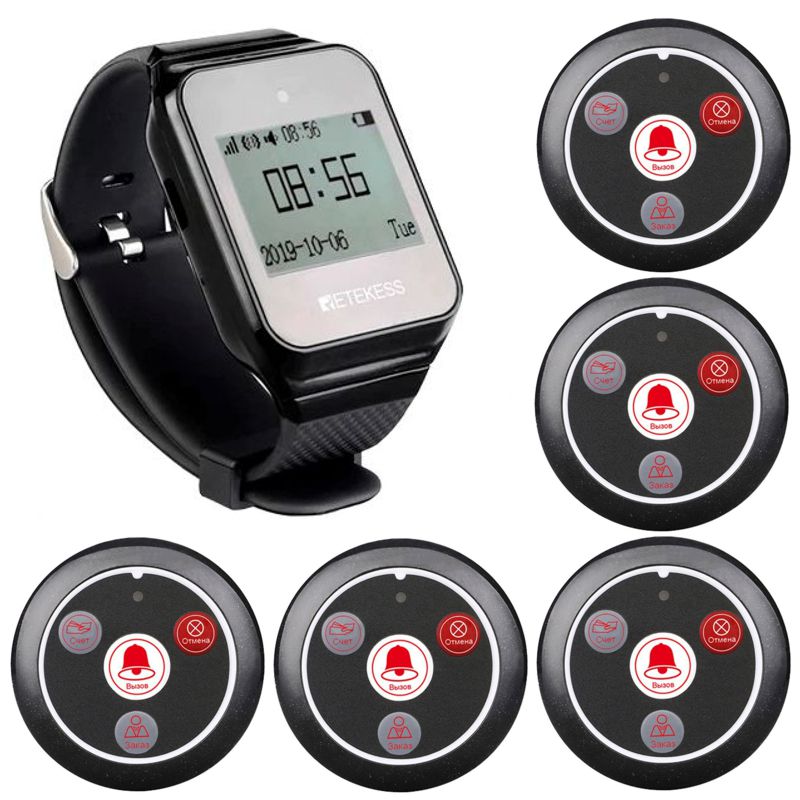 Система виклику офіціанта бездротова з чорним годинником - пейджером Retekess TD109 + 5 чорних кнопок (з кнопкою ЗАКАЗ)