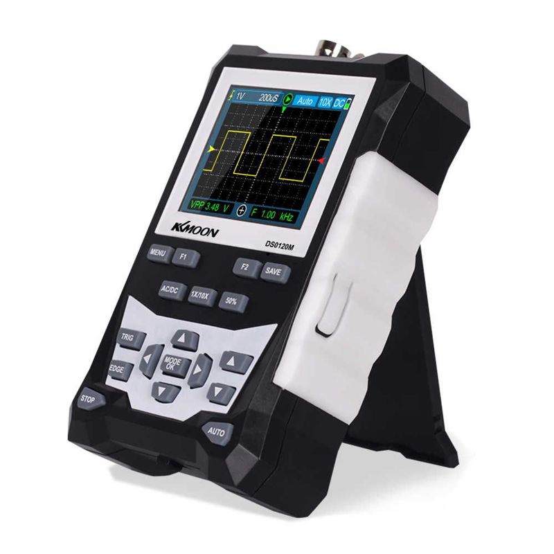 Найкращий портативний осцилограф за свою ціну Осцилограф цифровий портативний з акумулятором KKMOON DS0120M, 120 МГц 500 Мб / с, генератор сигналу - це універсальний, дуже практичний, економічний ручний осцилограф для індустрії технічного обслуговування і радіоаматорів з частотою дискретизації в реальному часі до 500 Мвиб/с і аналогової смуги пропускання 120 МГц. З функцією повного запуску (одиночний, нормальний, автоматичний), він може бути використаний вільно як для періодичного аналогового сигналу, так і для неперіодичного цифрового сигналу. Вбудований модуль захисту від високої напруги, може витримувати до 400 В безперервної напруги. У комплекті поставки щуп з дільником 1:10 що дозволяє приводити високу напругу до діапазону вимірювання осцилографа і не турбуватися про згорання входу осцилографа, викликаного високою напругою. Прилад виводить зображення форм сигналів на РК-дисплей високої чіткості з 2,4"діагоналлю і дозволом в 320 х 240 точок. Даний дозвіл досить великий для компактного дисплея в 2,4 дюйма. Надзвичайно зручна і швидка функція зберігання сигналів на вбудовану пам'ять, яка може зберігати до 2500 зображень форм сигналів. Процес зберігання простий і швидкий, зберігає форму сигналу в будь-який час і в будь-якому місці. Вбудований літій-іонний акумулятор високої якості 3000 мАг, може використовуватися безперервно протягом 6 годин при повній зарядці. Час зарядки триває, близько 3 годин. Корпус оснащений високоякісним силіконовим захисним чохлом, нетоксичним і не містить шкідливих речовин. Також корпус протиковзаючий, протиударний і з високою діелектричної здатністю, м'якою текстурою. Такий компактний корпус зручний і ергономічний. Внизу приладу знаходиться вмикач живлення. Зверху розташовані роз'єм BNC для підключення щупа і контакт виходу генератора сигналу (калібратор). Даний генератор в першу чергу потрібен для калібрування схеми компенсації паразитної ємності щупа яка знаходиться в самому щупі. Дане калібрування виконується з включеним дільником на 1:10 і обертаючи підлаштовувальний резистор біля роз'єму BNC щупа треба домогтися максимально прямокутного сигналу (на фронті і спаді). Осцилограф KKMOON DS0120M - це універсальний багатофункціональний портативний прилад, який підходить для робіт ремонтних груп на виїздах, сервісів і для початківців радіоаматорів, так як ціна досить невисока. Компактні розміри дозволять зручно помістити прилад на робочому місці із застосуванням розкладний ніжки ззаду корпусу. Смуга пропускання 120 МГц, достатня для вирішення більшості сучасних завдань, як любителів, так і професіоналів. Прилад був перевірений, і обраний нашими інженерами, як модель, з найкращим співвідношенням ціна / якість / характеристики. Рекомендуємо і Вам, переконатися в цьому! Основній особливості Чіткий контрастний екран 320 х 240 LCD, на якому добре видно зображення. Пропускна здатність 120 МГц і частотою вибірки 500 Мвиб/с. Генератор прямокутного сигналу: 1 кГц, 10 КГц, 100 КГц, 1 МГц. 12 видів вимірювання параметрів: Vpp, Vrms, Vavg, Vp, Vmax, Vmin, F, T, T +, T-. Du +, Du-. Три режими сканування: автоматичний, нормальний і поодинокий. Може зберігати 2500 осцилограм, підтримує перегляд. Параметри хвильової форми, такі як база часу, амплітуда і нахил тригера, можуть бути встановлені автоматично. Силіконова захист по обидва боки корпуса, анти змінна, ударостійка, ергоном