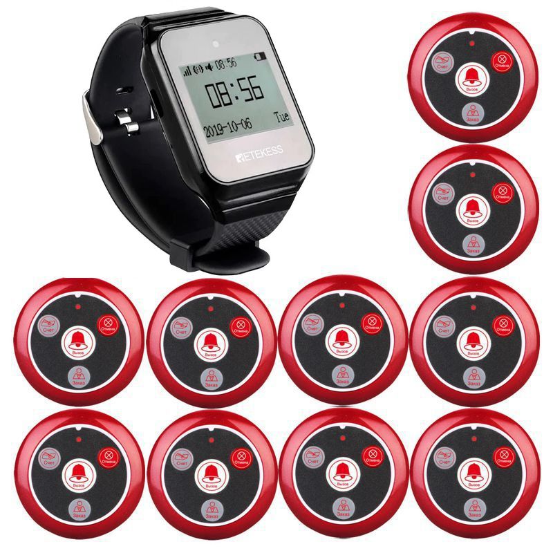 Система виклику офіціанта бездротова з чорним годинником - пейджером Retekess TD108 + 10 червоних кнопок (з кнопкою ЗАКАЗ)