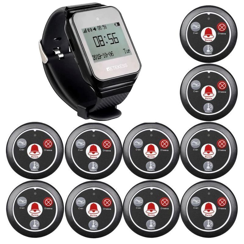 Бездротова система виклику офіціанта російською мовою Для організації якісного і швидкого обслуговування клієнтів в ресторані або кафе або для зручного виклику офіціанта клієнтом - була розроблена бездротова система виклику офіціантів Retekess TD109. З її допомогою ви зможете налагодити прямий зв'язок ваших клієнтів з персоналом, забезпечивши своєчасне прийом і виконання замовлень ваших відвідувачів. Головною особливістю даної системи є підписи кнопок виклику російською мовою і можливість вибору російської мови в годиннику офіціанта. Пейджингова система виклику офіціанта складає комплект з 10 кнопок з годинником - пейджером для прийому сигналів від бездротових кнопок. При натисканні кнопки виклику клієнтом, яка встановлюється на кожному столику - годинник повідомляють офіціанта або декількох офіціантів (при використанні декількох годин) звуком, вібрацією і / або світловою індикацією номер вхідного столика і типі виклику (звичайний виклик, рахунок або кальян). Підписи позначення Кнопов в годиннику можна міняти на інші значення з 20 варіантів. Меню для налаштування і роботи системи є російською мовою. Максимальна дальність передачі сигналу між кнопками і годинами становить до 80 метрів, що цілком достатньо в 99% випадків. До одним годинах - пейджера можна прив'язати до 999 кнопок, в тому числі і інших сумісних моделей. Так само одну кнопку можна прив'язати відразу до декількох годин. Залежно від організації роботи ваших офіціантів - можна закріпити конкретних офіціантів за конкретними столиками (кнопками виклику) або зробити, щоб все офіціанти обслуговували всі столики (всі отримують на годинник сигнал виклику, а обслуговує той, хто вільний у даний момент часу). Живлення годинника - пейджера передбачено від вбудованого акумулятора 500 мАг, якого вистачає при інтенсивній роботі на 2-3 доби. На дисплеї є індикатор заряду. Кнопки працюють від змінних батарейок типу CR3032, яких вистачить до 1 року роботи. Відмінність від інших аналогічних систем виклику полягає в тому, що 4 кнопки дозволяють не тільки передати сигнал, але і вказати офіціантові який саме вид дій збирається провести клієнт (зробити замовлення їжі, замовити кальян або попросити рахунок). До того ж меню системи має дуже гнучку настройку за видами виклику, що відображаються на екрані годин. Наприклад при натисканні кнопки можна замість "Офіціант", "Розрахунок" встановити вид виклику "Кава", "Вода" і т.д. Якщо система використовується наприклад в медичних установах. Ви можете навіть призначити певний вид виклику при одночасному натисканні на 2 або навіть три кнопки. Це дозволяє вам налаштувати даний комплект під абсолютно будь-які завдання. Основні особливості і характеристики Стандартна система виклику офіціанта полягає из 1 годин і 10 кнопок виклику. При необхідності, Ви можете докупити потрібну кількість додаткових кнопок виклику або годин. 3 види оповіщення на годиннику - звук, вібрація або миготіння світлом. Гнучка настройка видів оповіщення. Встановлення кількості повідомлень - 1,3 або 5 разів. Дальність передачі сигналу між кнопками і годинами - до 80 метрів. Робоча частота 433,92 МГц, дозволяє підключити додаткові кнопки будь-якого типу з відповідною частотою роботи. Підтримка до 999 кнопок. 4 клавіші на кнопці з російськими позначеннями: ""визов, счет, отмена, кальян" або "визов, сч