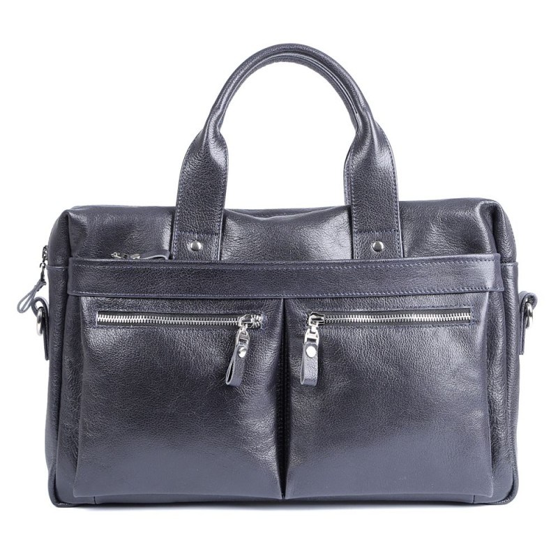 Надійна чоловіча сумка з натуральної шкіри приємної на дотик. Колір фурнітури: срібло. На лицьовій стороні виробу розташовані дві невеликі симетричні кишені на блискавці, а також відділення на блискавці. На задній зовнішній стороні знаходиться відділення на блискавці. Сумка надійно прошита надміцною ниткою. Переносити цей аксесуар можна в руці, а також через плече (в комплекті знімний, регульований плечовий ремінь). Шкіряна чоловіча сумка – це чудове рішення для подарунка чоловікові до будь-якого свята.